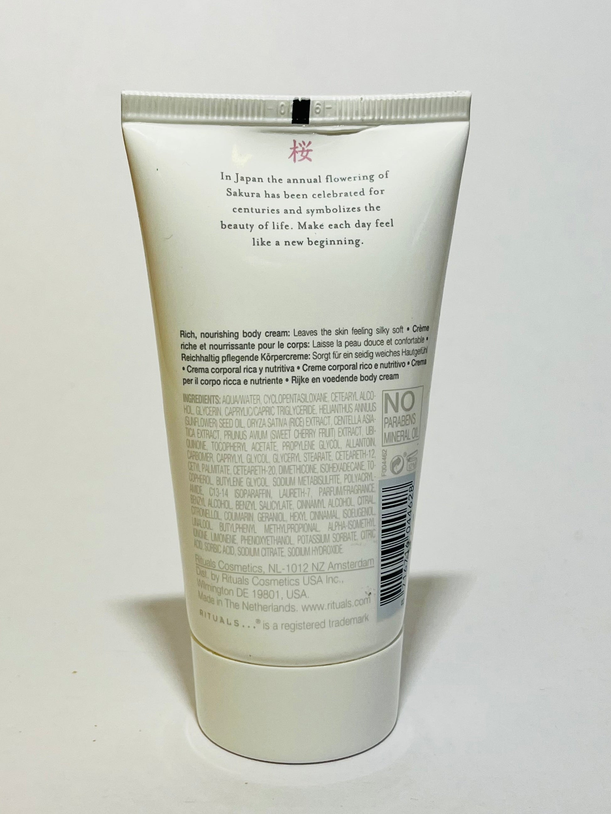 Duft: Kroppskremen er tilsatt den delikate duften av kirsebærblomst (Sakura) og rismelk. Duften er lett, floral og beroligende, og fremkaller en følelse av fred og fornyelse.
